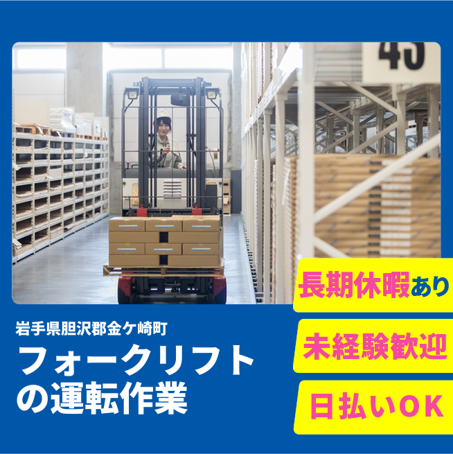 給与詳細 月収例 268,500円 日給例 12,000円 勤務地 岩手県胆沢郡金ケ崎町 仕事内容 【フォークリフト運転作業】