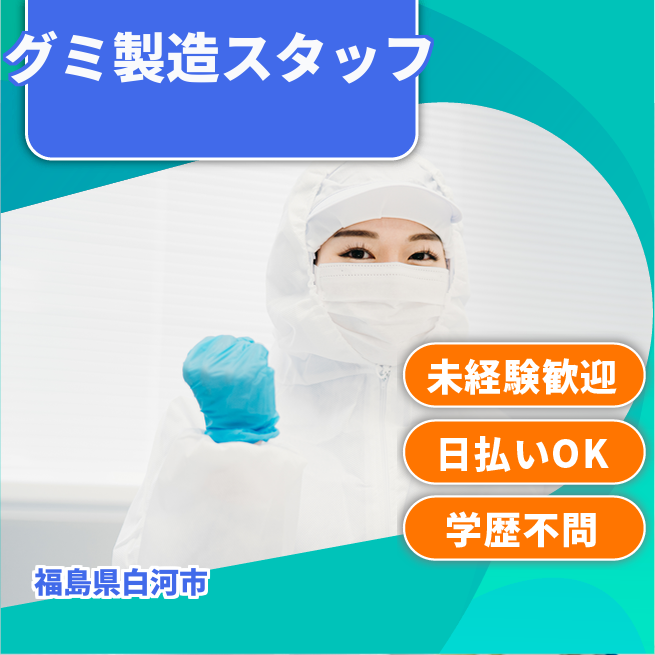 給与詳細 月収例 209,560円 時給例 1,040円 勤務地 福島県白河市 仕事内容 【グミ製造スタッフ】
