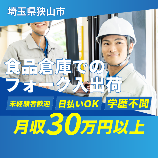 給与詳細 月収例 304,150円 日給例 11,200円 勤務地 埼玉県狭山市 仕事内容 【倉庫内でのフォークリフト業務】