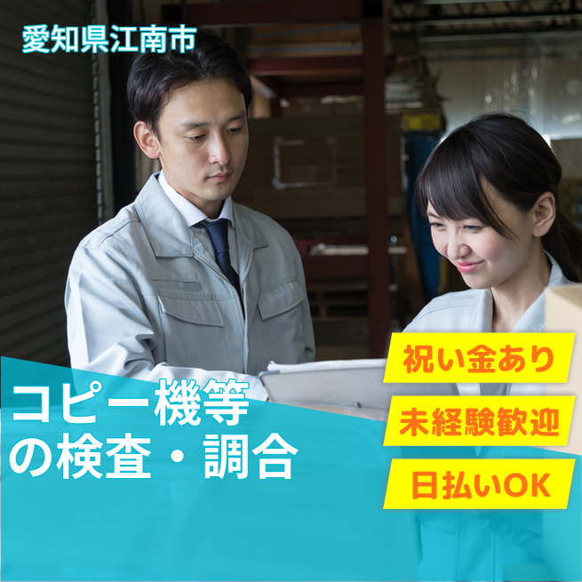 給与詳細 月収例 265,650円 日給例 11,200円 勤務地 愛知県江南市 仕事内容 【コピー機等部品の検査・調合・機械操作作業】