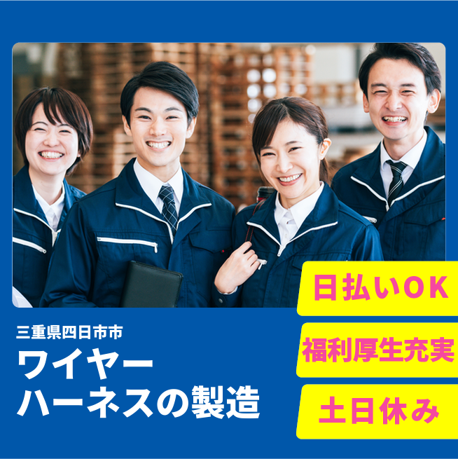 給与詳細 月収例 226,130円 日給例 10,800円 勤務地 三重県四日市市 仕事内容 【自動車用ハーネス組立・ピッキング】
