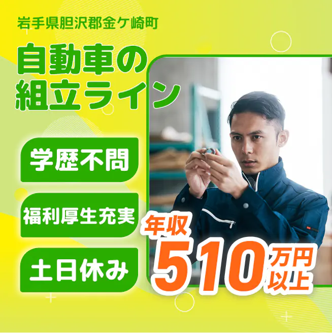 給与詳細 年収例 5,177,220円 月収例 431,435円 勤務地 岩手県胆沢郡金ケ崎町 仕事内容 【自動車製造ライン作業】