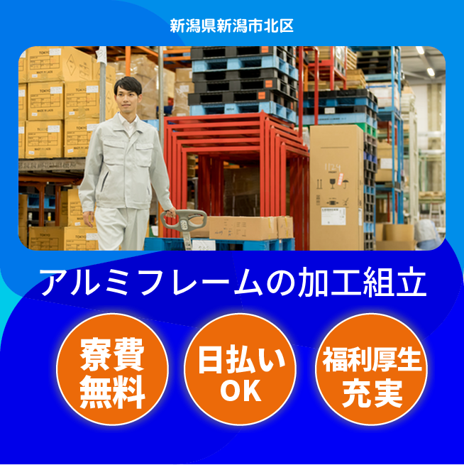給与詳細 月収例 257,687円 日給例 10,080円 勤務地 新潟県新潟市北区 仕事内容 【アルミ製品の加工・組み立て・検査】