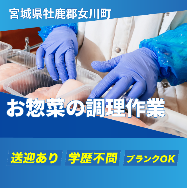 給与詳細 月収例 176,400円 時給例 1,050円 勤務地 宮城県牡鹿郡女川町 仕事内容 【お惣菜の調理作業】