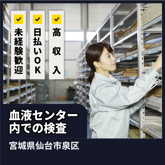 血液センター内で、血液製剤の製造補助や検査、記録入力を行うお仕事です。重い物の取り扱いはほぼなく、女性も多数活躍。Word・Excelの基本操作ができれば未経験からでも始められ、2~3週間で就業可能です。