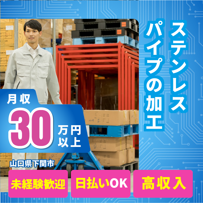 大手メーカーの工場で、ステンレスパイプの製造(機械操作・製品チェック)をお任せします。「工場は初めて」という方も充実した研修でサポート。月収30万円以上も可能です。