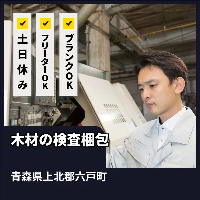 給与詳細 月収例 275,760円 時給例 1,150円 勤務地 青森県上北郡六戸町 仕事内容 【木材の検査・梱包作業】