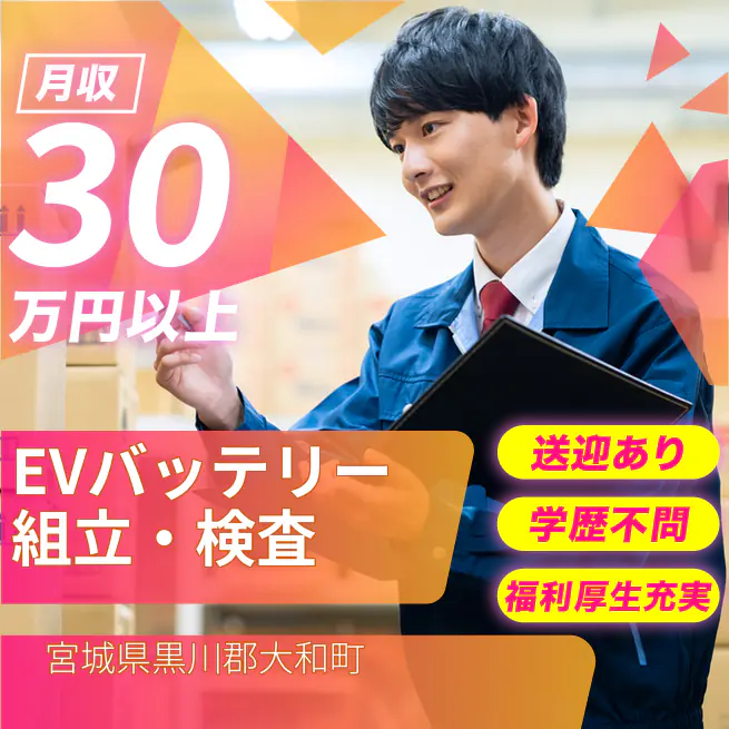 給与詳細 月収例 301,640円 日給例 11,600円 勤務地 宮城県黒川郡大和町 仕事内容 <ハイブリッド車用電池の製造> 組付け・検査・運搬を担当。