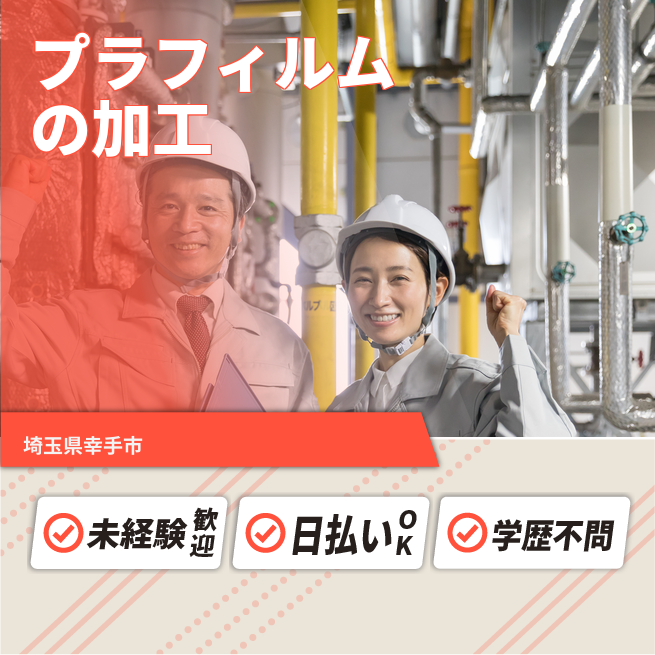 給与詳細 月収例 252,931円 日給例 11,200円 勤務地 埼玉県幸手市 仕事内容 【食パンやゼリーに使われるプラスチックフィルムの加工】