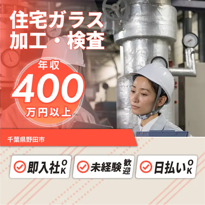 給与詳細 月収例 301,125円 日給例 12,000円 勤務地 千葉県野田市 仕事内容 【ガラス製品の製造オペレーター】