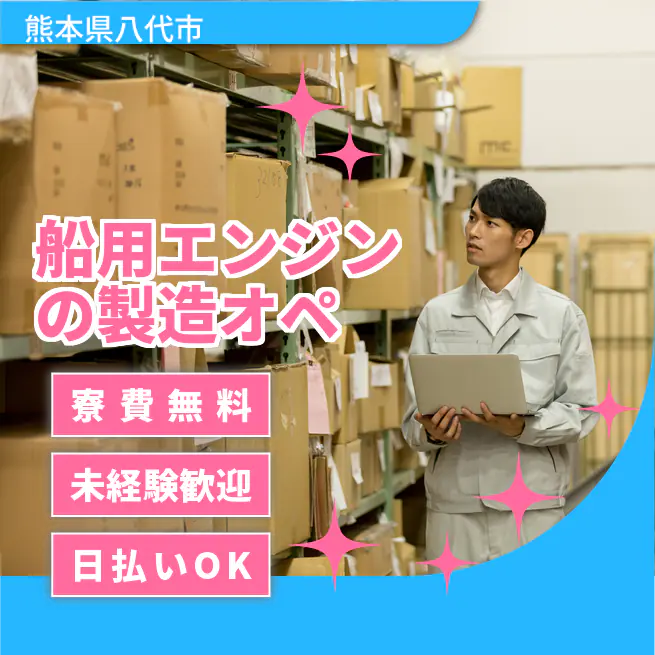 給与詳細 月収例 273,000円 日給例 11,200円 勤務地 熊本県八代市 仕事内容 【船用エンジンの製造スタッフ】