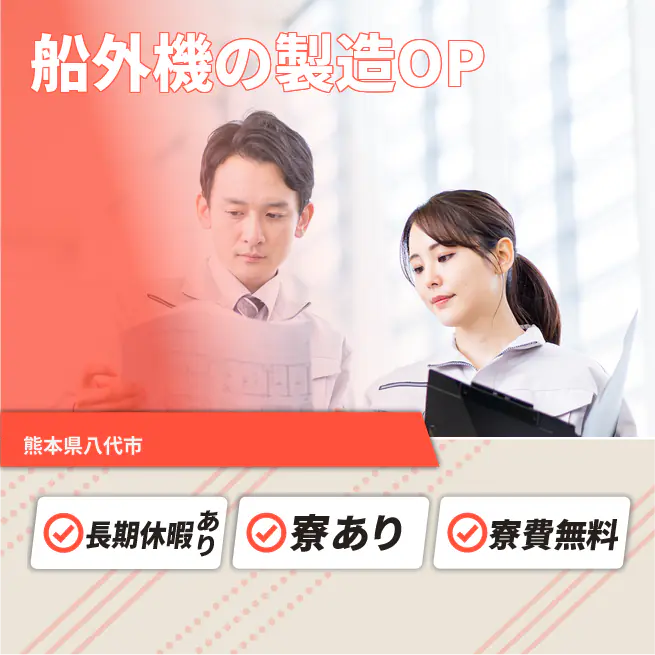 船外機(船用エンジン)部品の加工・塗装・検査・組立など製造OP。