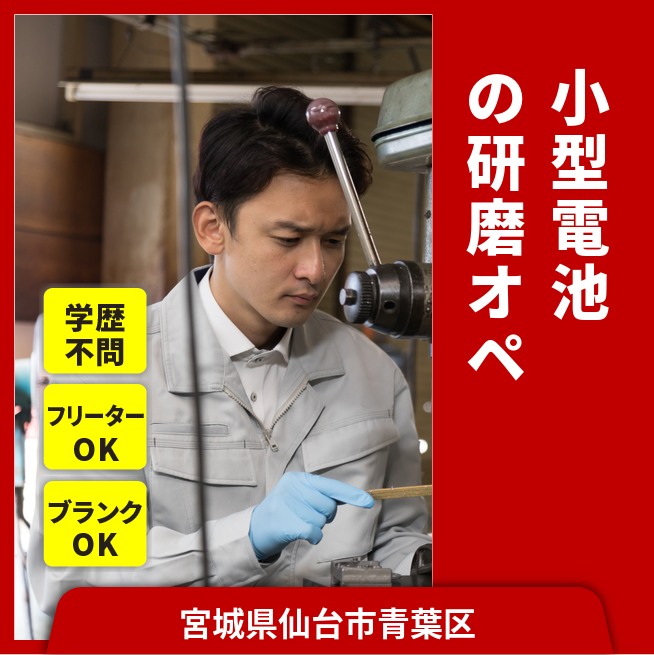 給与詳細 月収例 258,258円 日給例 11,200円 勤務地 宮城県仙台市青葉区 仕事内容 【業務概要】小型電池研磨オペレーター