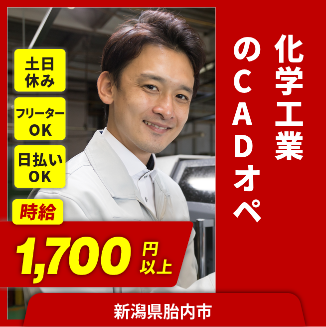 給与詳細 月収例 263,500円 時給例 1,700円 勤務地 新潟県胎内市 仕事内容 【化学工業 のCADオペレーター】