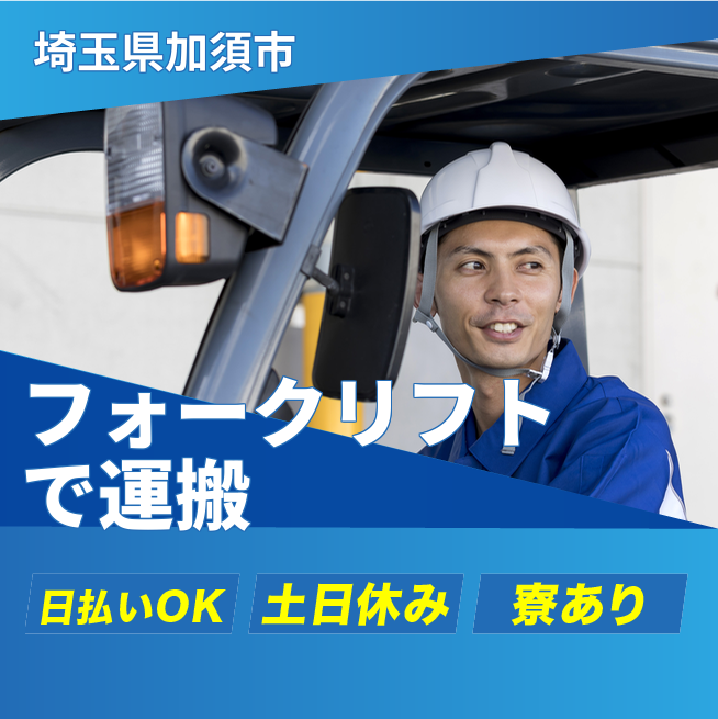 給与詳細 月収例 241,312円 日給例 10,800円 勤務地 埼玉県加須市 仕事内容 【リーチ式フォークリフト運搬】