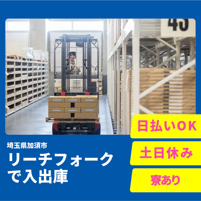 給与詳細 月収例 241,312円 日給例 10,800円 勤務地 埼玉県加須市 仕事内容 日用品の入出庫・フォークリフト作業(リーチ式)スタッフ募集