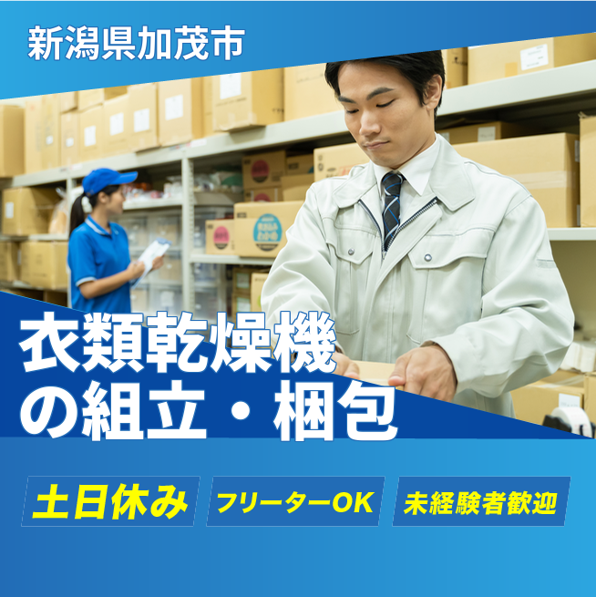 給与詳細 月収例 207,000円 時給例 1,150円 勤務地 新潟県加茂市 仕事内容 【家電製品(保温釜・衣類乾燥機)の組立・梱包スタッフ】