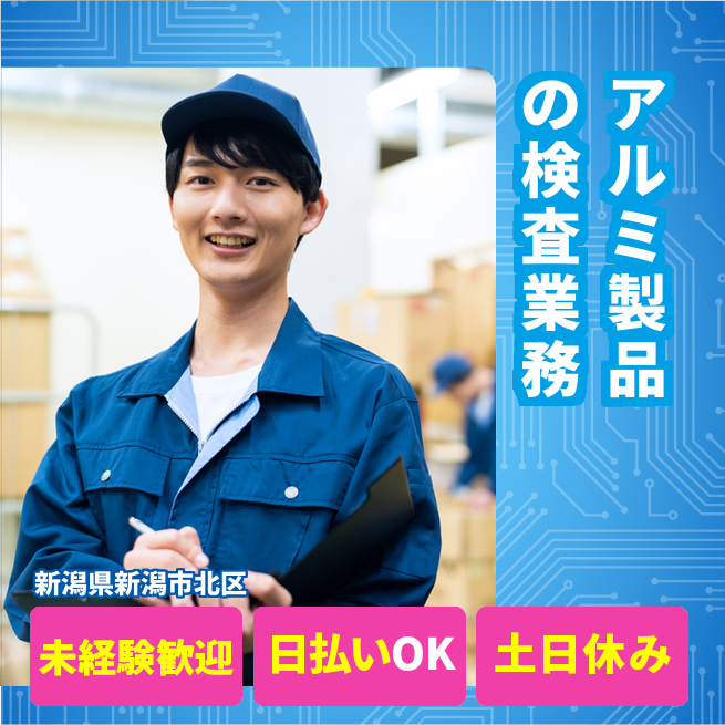 給与詳細 月収例 191,010円 時給例 1,100円 勤務地 新潟県新潟市北区 仕事内容 【アルミ製品の検査】