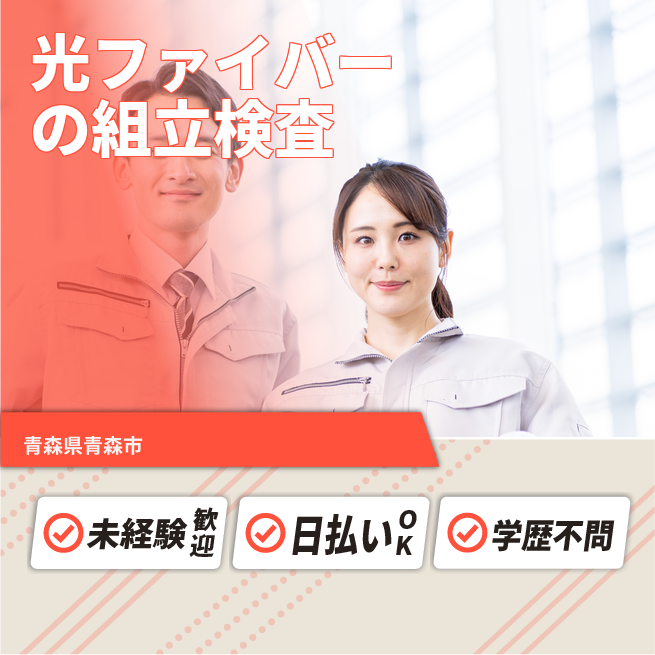 給与詳細 月収例 230,020円 時給例 1,150円 勤務地 青森県青森市 仕事内容 【光ファイバーケーブルの組立】