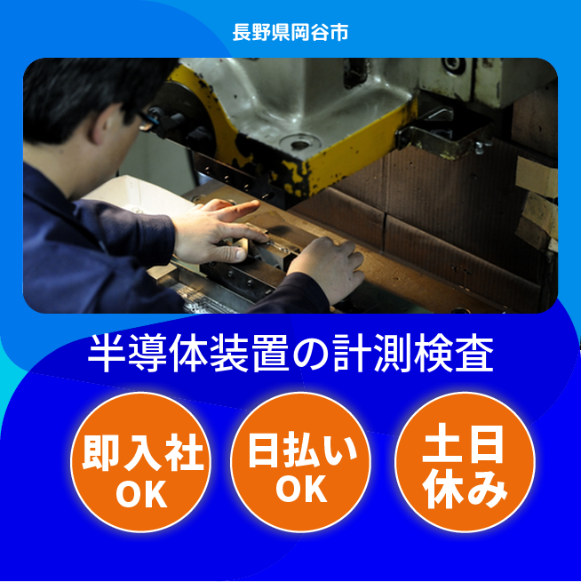 岡谷市の新設・キレイな工場で、半導体装置(FA機器)の組立(日勤)を担当。