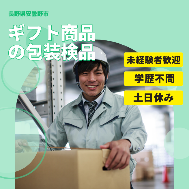 安曇野市のカタログギフトを扱う企業で、日勤のラッピング・検品・ピッキングなど軽作業を担当。土日休み。