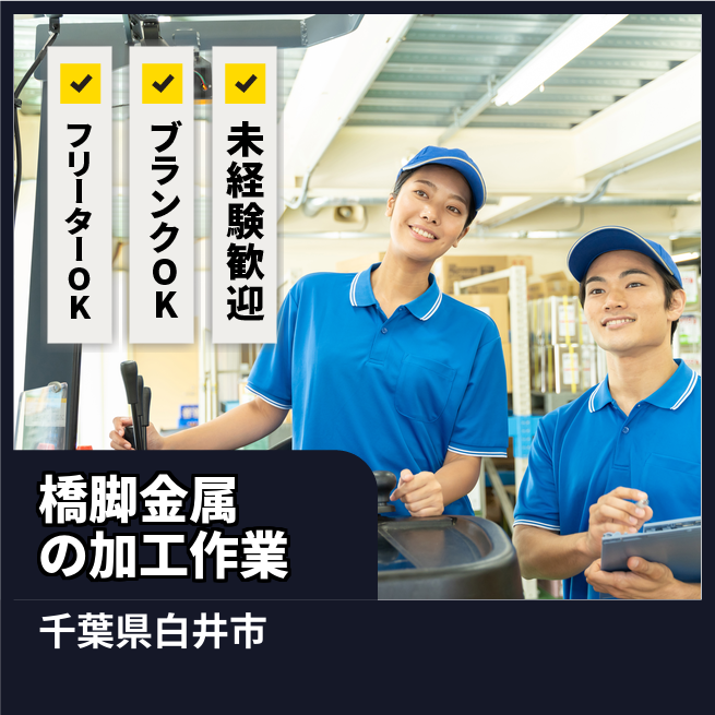 給与詳細 月収例 220,000円 日給例 11,000円 勤務地 千葉県白井市 仕事内容 橋脚用金属部材工場での金属部品の研磨・切断・穴あけ・プレス・バリ取りなどの加工作業です。ゆくゆくはクレーン・玉掛を使用して作業します。