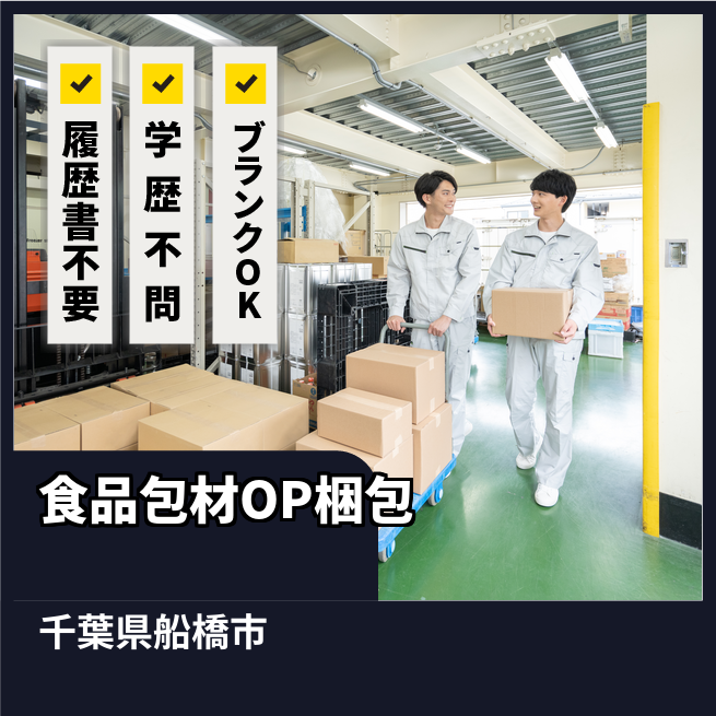 給与詳細 月収例 208,000円 日給例 10,400円 勤務地 千葉県船橋市 仕事内容 食品包装パッケージ製造:機械OP・梱包