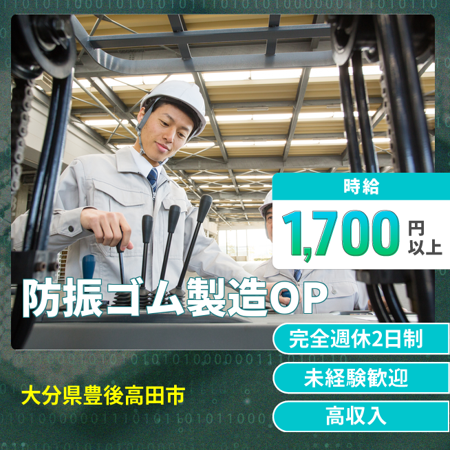 給与詳細 月収例 272,000円 時給例 1,700円 勤務地 大分県豊後高田市 仕事内容 自動車用防振ゴム部品の製造、機械オペレーター業務