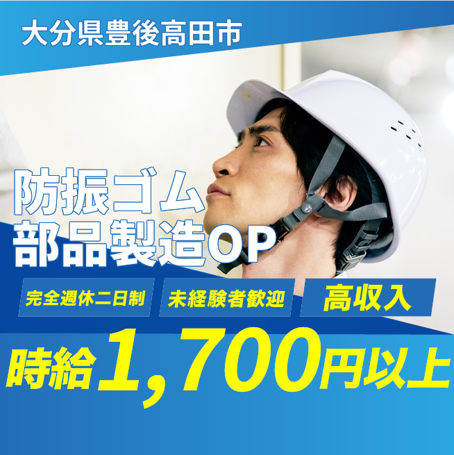 給与詳細 月収例 272,000円 時給例 1,700円 勤務地 大分県豊後高田市 仕事内容 自動車用防振ゴム部品の製造、機械オペレーター業務