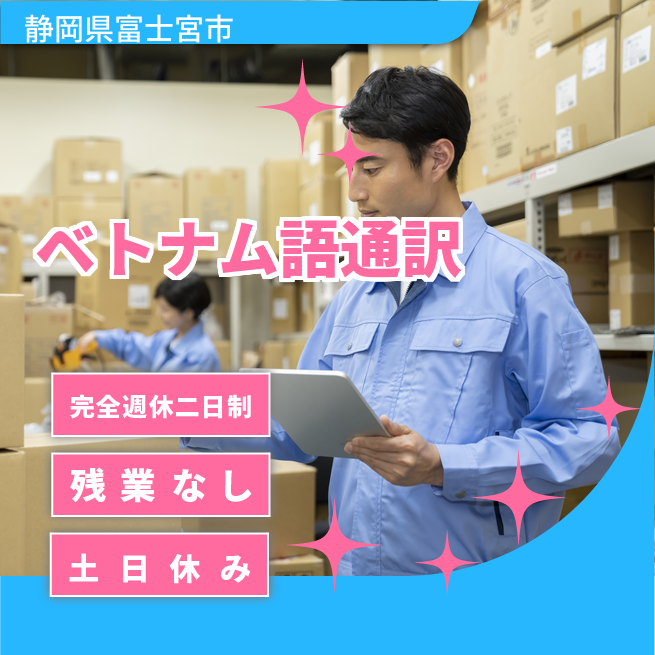 給与詳細 月収例 240,000円 日給例 12,000円 勤務地 静岡県富士宮市 仕事内容 ベトナム従業員への通訳と翻訳のお仕事です。