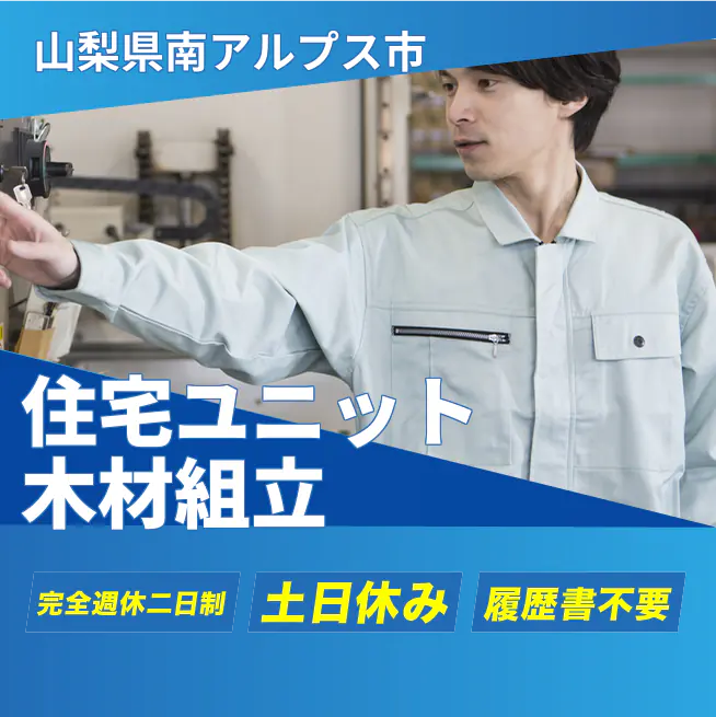 給与詳細 月収例 216,000円 日給例 10,800円 勤務地 山梨県南アルプス市 仕事内容 木材へのビス打ち等住宅ユニット製造のお仕事