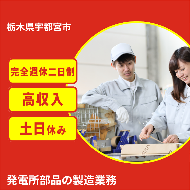 給与詳細 月収例 240,000円 日給例 12,000円 勤務地 栃木県宇都宮市 仕事内容 インフラ関係の製造 火力発電所や原子力発電所製品・新幹線や鉄道製品などの組立加工塗装業務