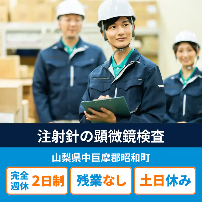 給与詳細 月収例 190,000円 時給例 1,188円 勤務地 山梨県中巨摩郡昭和町 仕事内容 注射針の検査業務になります。(フリー)
