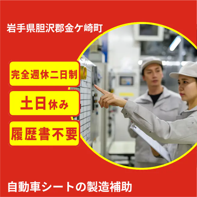 給与詳細 月収例 216,000円 日給例 10,800円 勤務地 岩手県胆沢郡金ケ崎町 仕事内容 自動車シートの製造補助