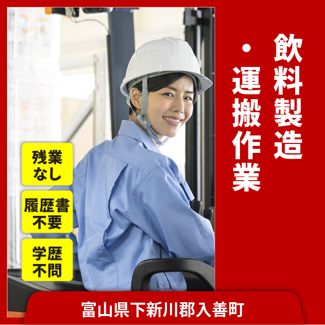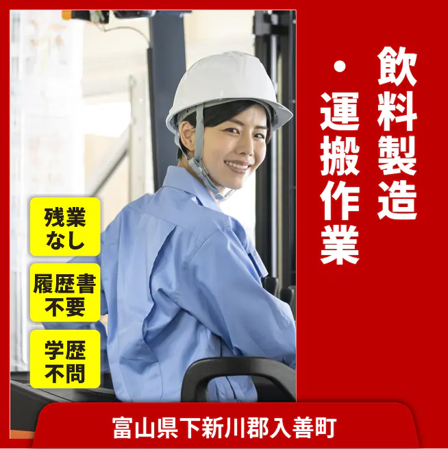 入社祝い金あり 【入社祝い金】 入社祝い金あり 応募の流れ 本ページ内<応募する>ボタンより、必要項目をご入力の上、ご応募ください。 勤務地 【勤務地】富山県下新川郡入善町- 勤務時間 【勤務地】8:00~16:15