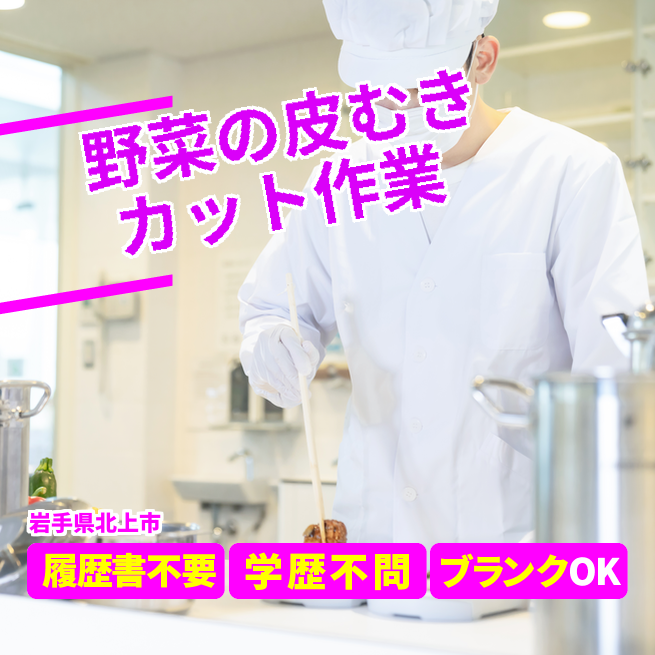 給与詳細 月収例 160,000円 時給例 1,000円 勤務地 岩手県北上市 仕事内容 野菜の皮むき、カット作業