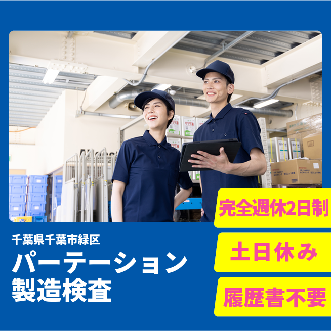 時給例:1400円 応募の流れ 本ページ内<応募する>ボタンより、必要項目をご入力の上、ご応募ください。 勤務地 【勤務地】千葉県千葉市緑区- 勤務時間 【勤務地】8:35~17:35 福利厚生 残業手当 公開日 2025年01月01日 部屋タイプ 単身者向けの1Rやカップル・家族向け2Kのルーム、ペットOKなど幅広いニーズに合わせてご用意しております! 家具・備品 テレビ・冷蔵庫・エアコンなどの家電を完備!すぐに新生活が始められます!※寮による その他 カップル・家族寮:あり