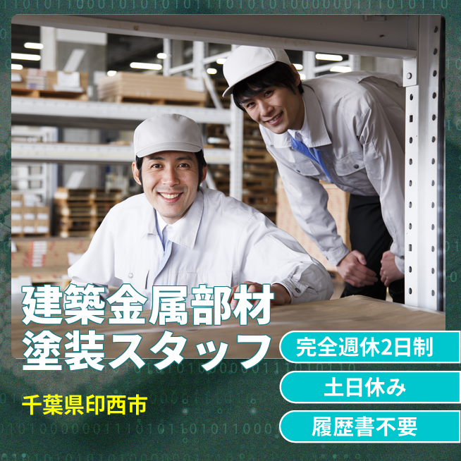 給与詳細 月収例 220,800円 日給例 11,040円 勤務地 千葉県印西市 仕事内容 建築用金属部材の塗装