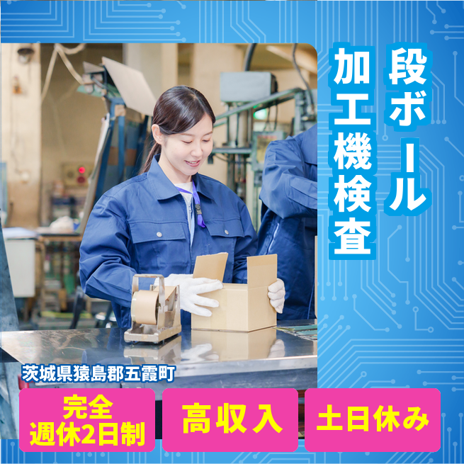 給与詳細 月収例 240,000円 日給例 12,000円 勤務地 茨城県猿島郡五霞町 仕事内容 段ボール加工品の機械OP、検査、梱包