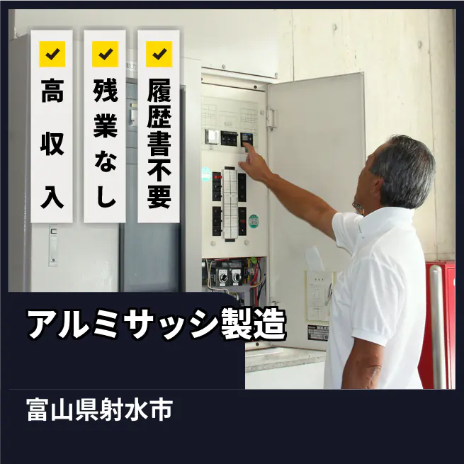 給与詳細 月収例 232,000円 日給例 11,600円 勤務地 富山県射水市 仕事内容 【業務内容】アルミサッシ部材やエクステリア製品の製造