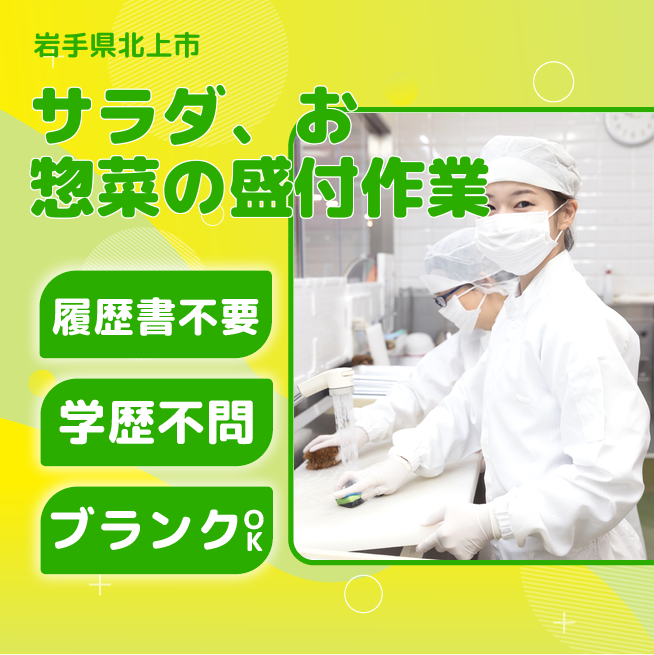 給与詳細 月収例 160,000円 時給例 1,000円 勤務地 岩手県北上市 仕事内容 サラダ、お惣菜の盛付作業