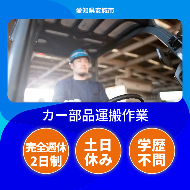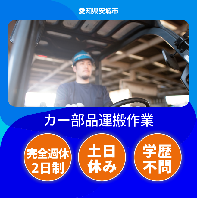 給与詳細 月収例 208,000円 日給例 10,400円 勤務地 愛知県安城市 仕事内容 カーエアコン部品の完成品の運搬、空箱の回収