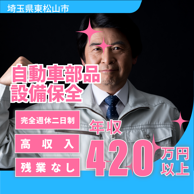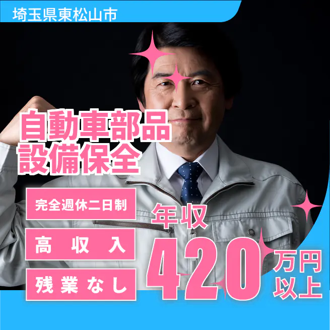 給与詳細 月収例 320,000円 時給例 2,000円 勤務地 埼玉県東松山市 仕事内容 主に自動車部品のトレーサーの保全業務を行います。