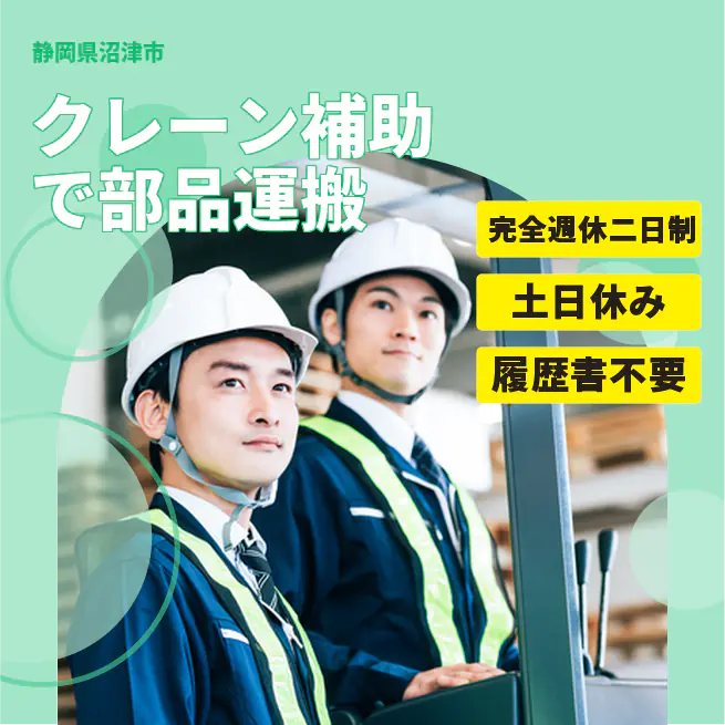 給与詳細 月収例 217,600円 日給例 10,880円 勤務地 静岡県沼津市 仕事内容 クレーンを使った製品・部品の運搬補助のお仕事
