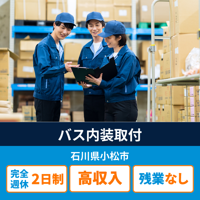 給与詳細 月収例 232,000円 日給例 11,600円 勤務地 石川県小松市 仕事内容 大型・中型バスの内張りの取り付け、艤装品の取り付けの作業及び、付随する作業。