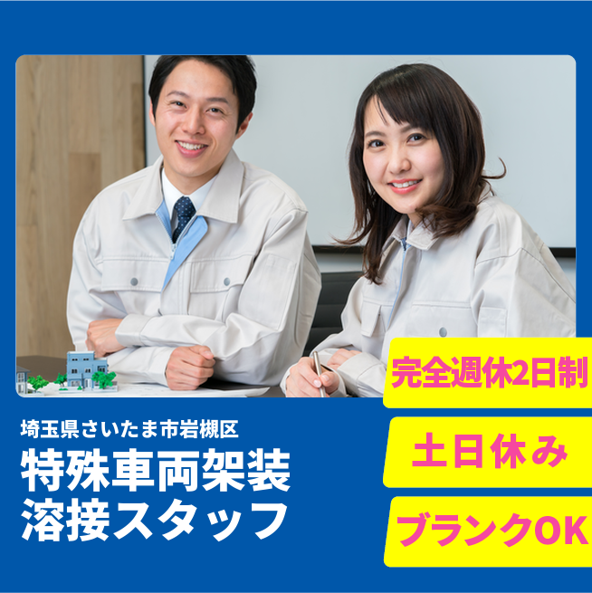 給与詳細 月収例 200,000円 日給例 10,000円 勤務地 埼玉県さいたま市岩槻区 仕事内容 特殊車両の架装や修理 組付け・溶接など 【月給制】