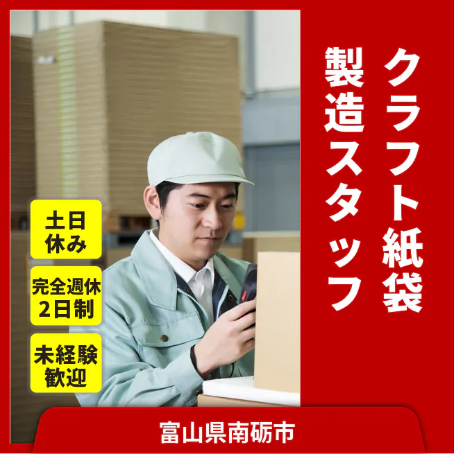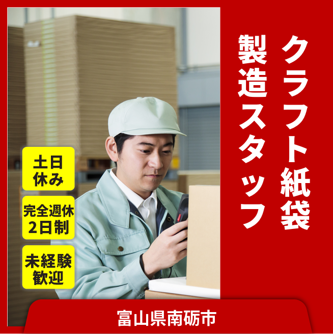 給与詳細 月収例 196,800円 時給例 1,230円 勤務地 富山県南砺市 仕事内容 業務用クラフト紙袋の製造。