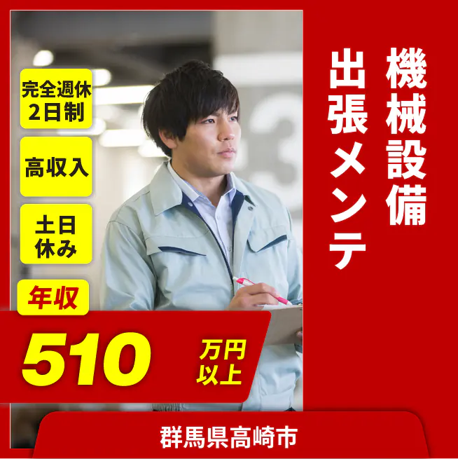 給与詳細 年収例 5,257,848円 月収例 380,000円 勤務地 群馬県高崎市 仕事内容 工場内やお客様先に行きメンテナンスを行います。※出張有