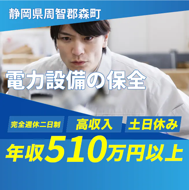 給与詳細 年収例 5,302,956円 月収例 400,000円 勤務地 静岡県周智郡森町 仕事内容 ・電力設備維持の為の中長期計画に沿い必要に応じ是正、更新を実施