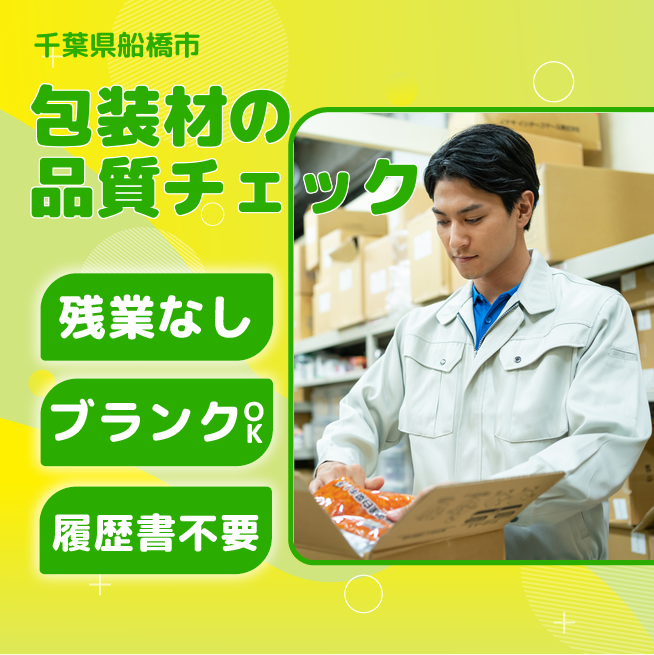 給与詳細 月収例 192,000円 時給例 1,200円 勤務地 千葉県船橋市 仕事内容 包装材の製造工場にてサンプル検査やチェック作業